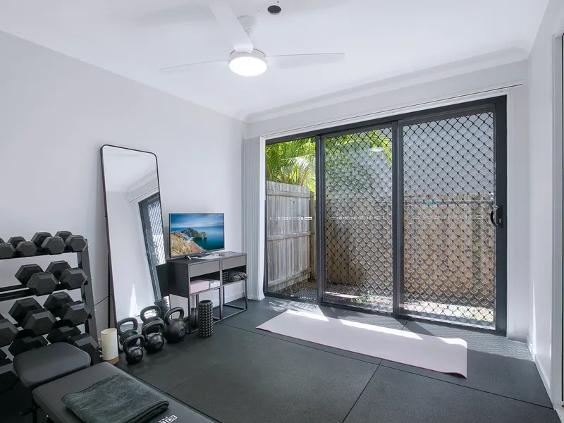 # Third bedroom downstairs, off the garage with access to the courtyard, ceiling fan and private ensuite