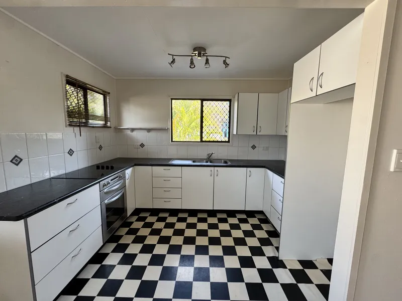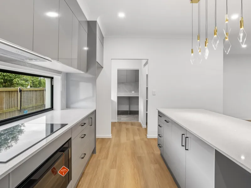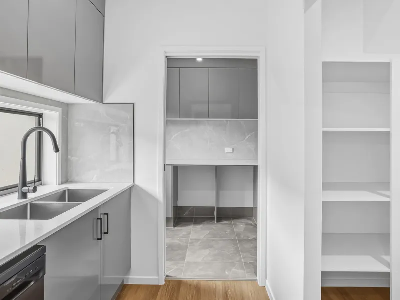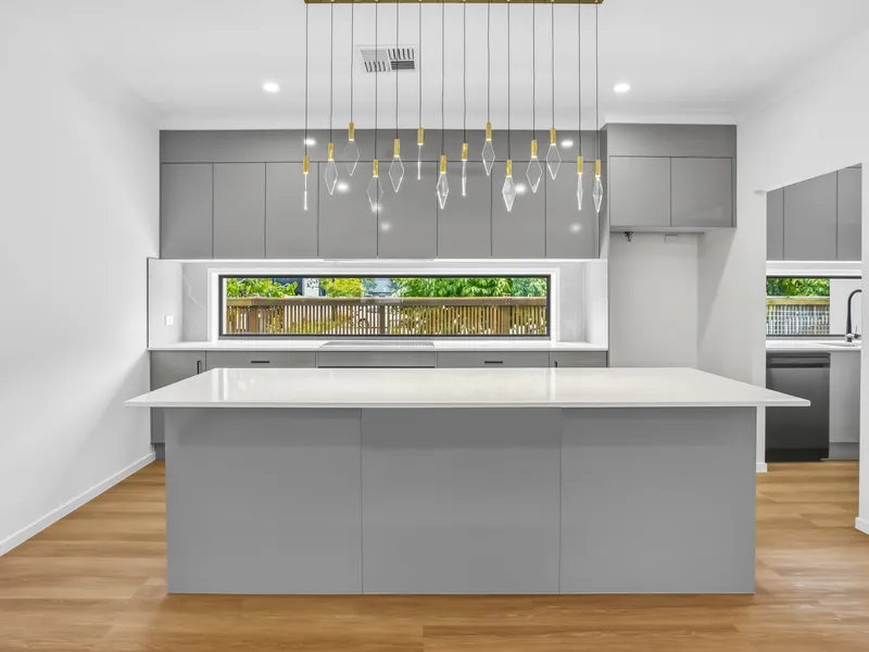 # Modern kitchen with appliances inclusive of dishwasher, rangehood, cooktop and oven. Large space for a fridge, ample preparation space and plenty of storage to cupboards & drawers.