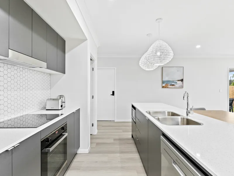 • Sleek Kitchen: Modern kitchen equipped with stone bench tops, stainless steel fridge, and electric cooking