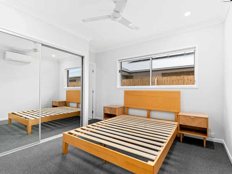 • Spacious furnished bedroom with queen bed (mattress not included), 2 bedside tables, wall-mounted TV, built-in wardrobes, air conditioning, and ceiling fan