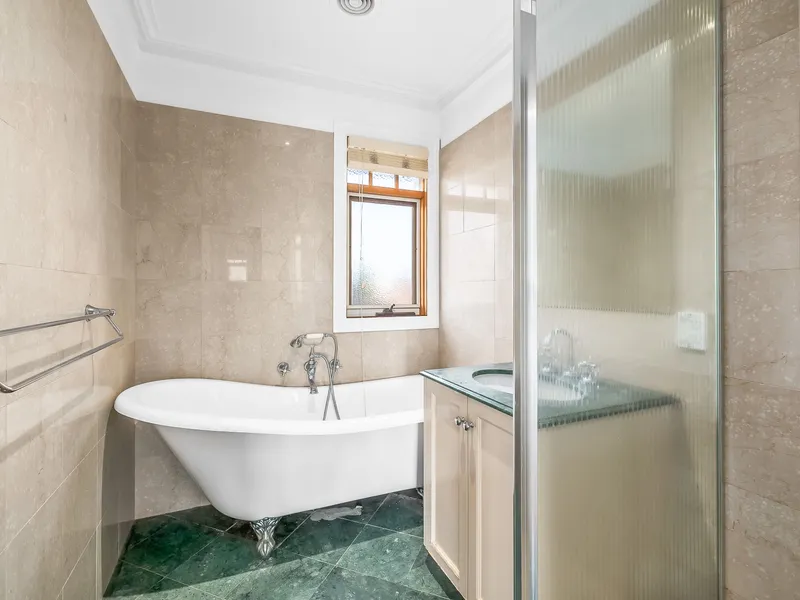 Upstairs, three generous bedrooms all feature polished floorboards. The master suite includes a private ensuite, second bathroom with bathtub servicing the remaining bedrooms.