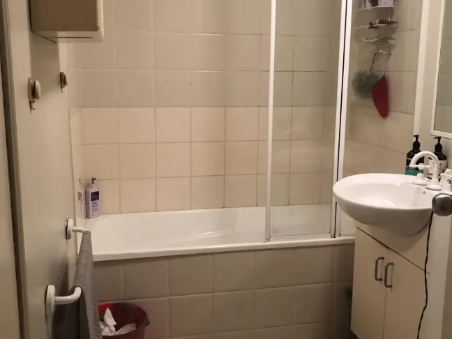 - A hallway takes you to the bathroom complete with A bath and washing machine taps tucked away European laundry style
