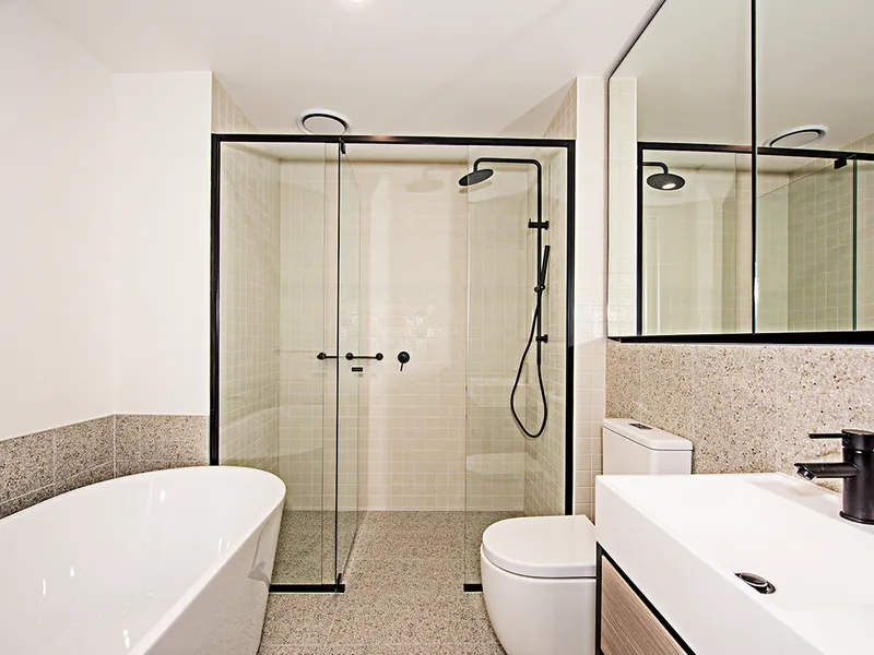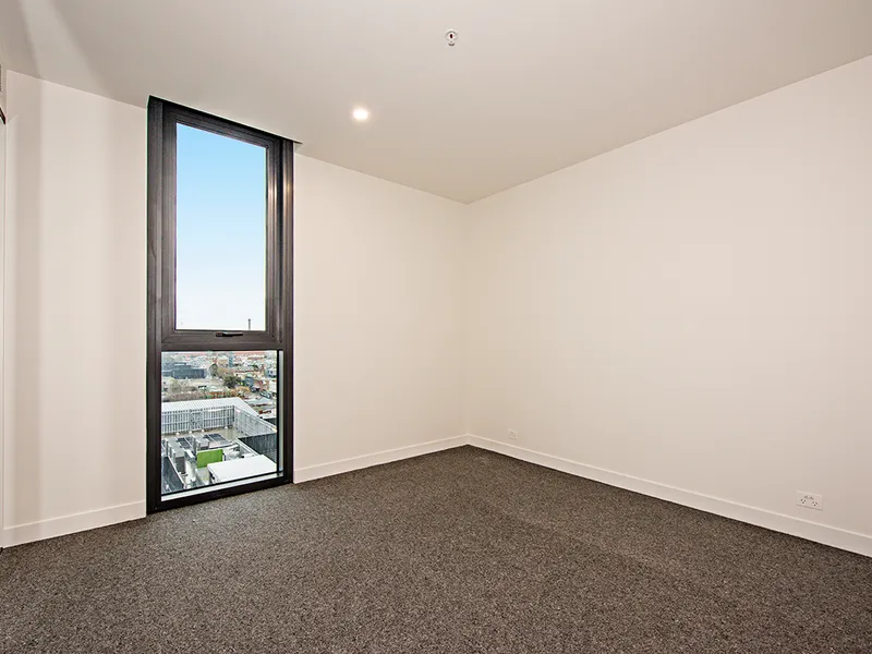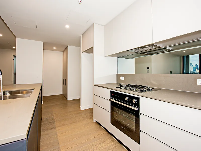 This luxurious 3 bedroom, 2 bathroom apartment offers a generous open plan living space with floorboards, spacious bedroom with full-size wardrobe, lavish bathroom with ample storage, and natural light with floor-to-ceiling windows.