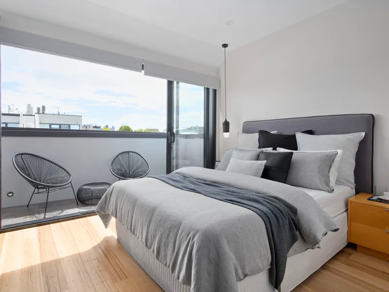 The living/dining room has high ceilings, floor to ceiling windows with a roof return and  is absolutely flooded with natural light. A western facing balcony provides a completely private place for an evening drink while a complementary screened balcony faces east adjoining the kitchen. A stylish Corian island bench/breakfast bar is a feature of the kitchen, which has an integrated fridge/freezer and also a wine fridge. There is an induction cooktop, quality Miele appliances and copious soft close storage.