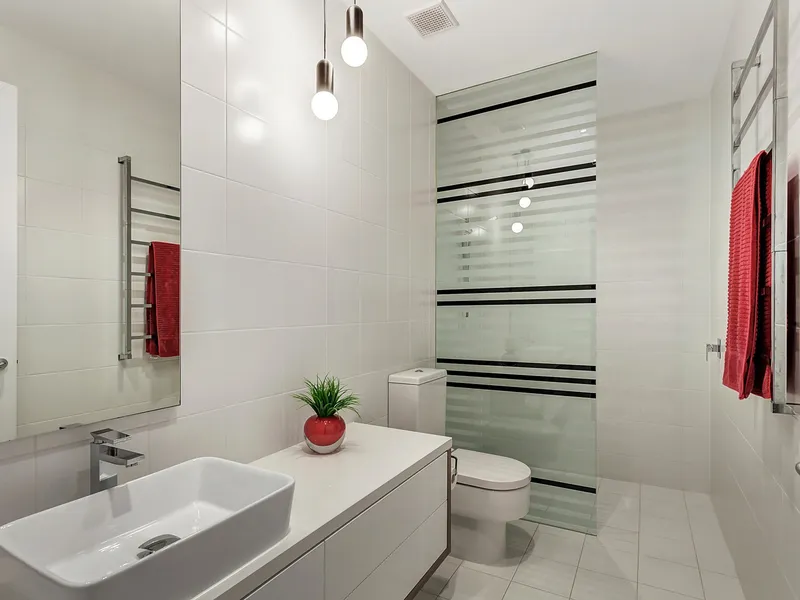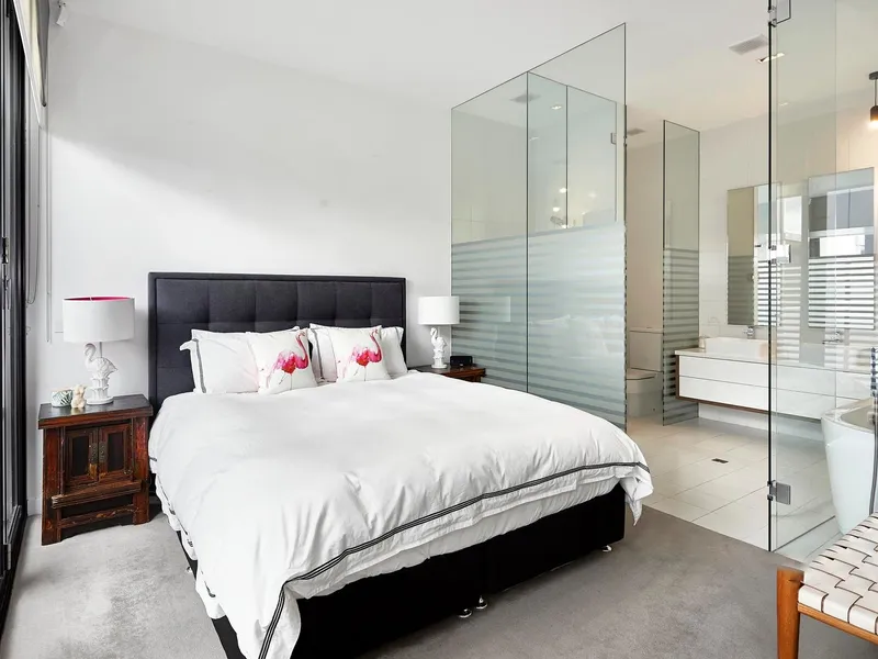 An immaculate main ensuite bedroom features a luxurious bathroom with stylish freestanding bath and private balcony saturated with northern light. Two additional bedrooms with privacy latches, share a deluxe central bathroom and powder room.