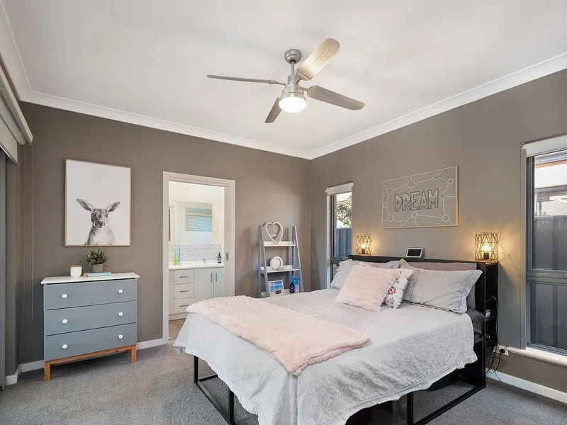 - Main bedroom featuring a queen bed, ceiling fan, built-in wardrobe and ensuite with dual sinks and twin shower heads