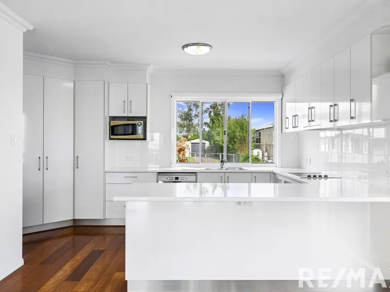 The main living level features beautiful timber flooring throughout an open-plan living and dining area, flowing seamlessly onto a large covered balcony — the perfect spot for entertaining or simply taking in the outlook. The modern kitchen sits at the heart of the home with ample bench space, storage and a layout designed for easy living.