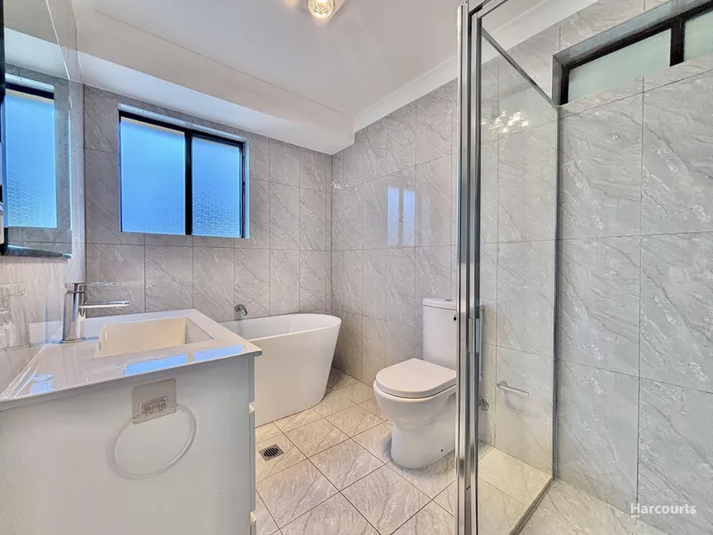 Tiled flooring throughout ensures easy maintenance, complemented by updated blinds and freshly painted throughout, modern feel. The main bathroom is well-appointed with a separate shower and deep bathtub, along with the added convenience of a second toilet.