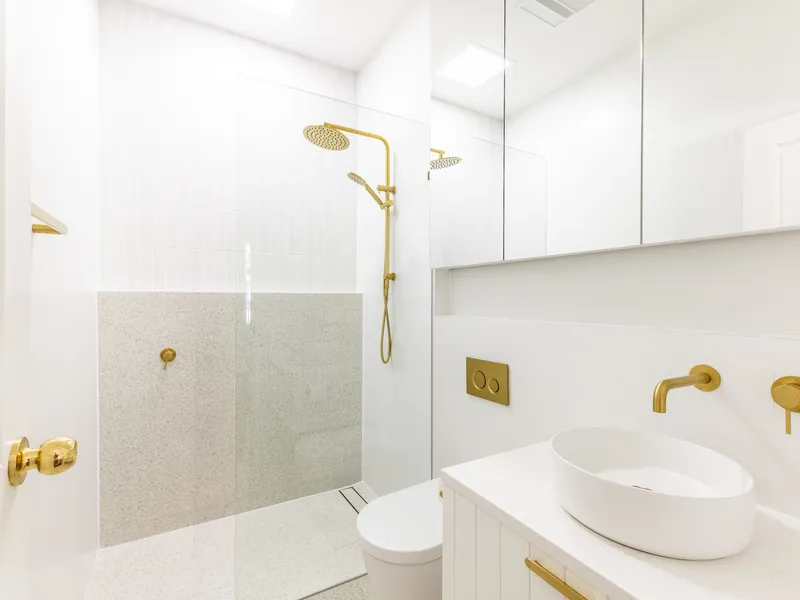 - Stylish bathroom with separate bath and shower; integrated laundry space