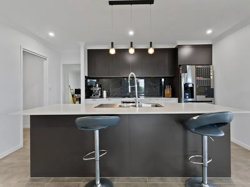 The kitchen features a large island bench with breakfast bar and dishwasher, gas cooktop, modern pendant lighting and stylish black marble tiled splashback.