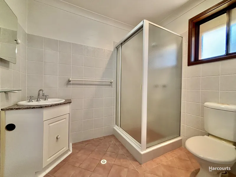 The home includes a separate bedroom with built-in wardrobe and a modern bathroom with integrated laundry facilities. Outside, enjoy the shared yard with clothesline, perfect for low-maintenance living.