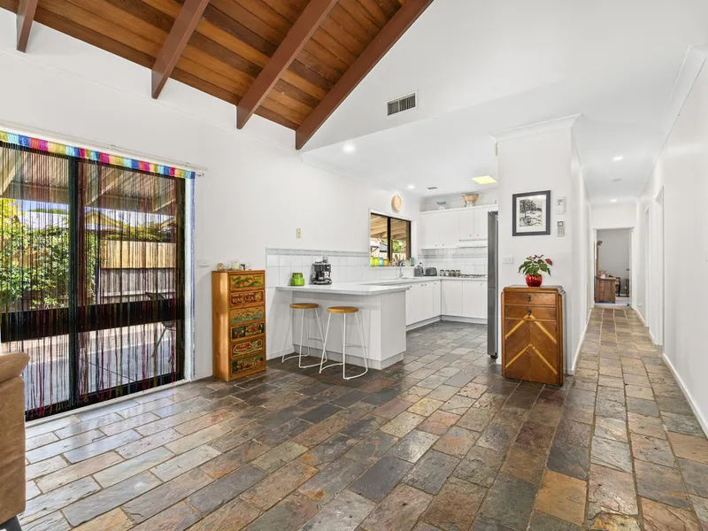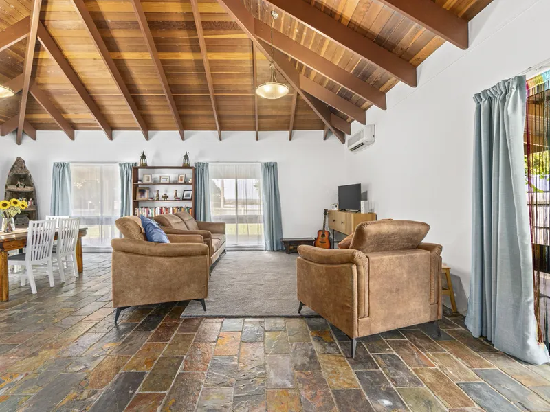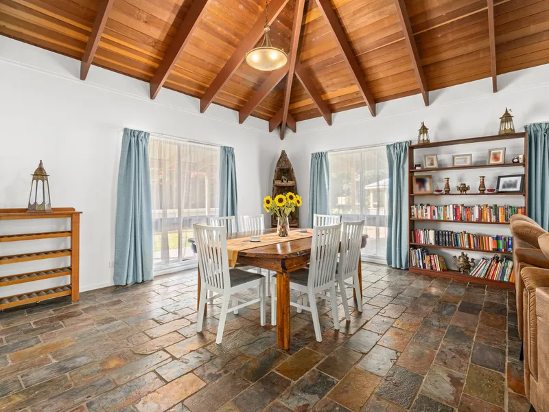 Be greeted by a spacious entry that sets the tone for the rest of the home. Enjoy the comforts this property has to offer with three bedrooms, each with built-in robes, and two bathrooms, including a sleek modern ensuite to the master. Entertain effortlessly in the open-plan living and meals area, featuring soaring timber-lined ceilings that exude warmth and character. The adjoining kitchen connects seamlessly to the outside entertaining area.