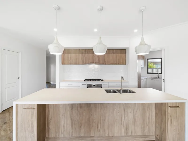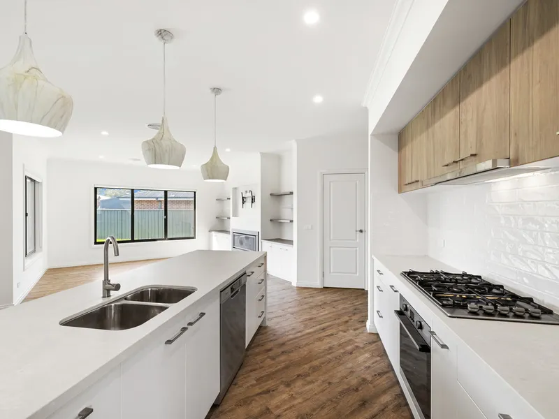 The heart of the home is the open-plan kitchen, meals, and family area — a versatile space designed for both entertaining and everyday living. The contemporary kitchen will impress with its large island bench, stone countertops, quality appliances, soft-close drawers, and a fully equipped butler's pantry for seamless meal prep and storage.