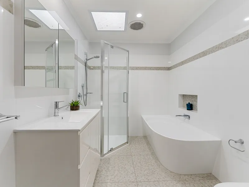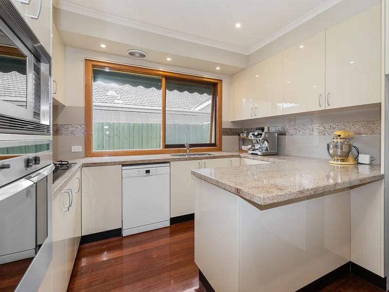 This beautifully presented and generously sized family home offers comfort, flexibility and charming indoor–outdoor living, making it ideal for families seeking space and convenience. The home welcomes you with a light-filled formal living room featuring a cosy gas fireplace, while a second open-plan living and dining area flows seamlessly to a private courtyard and spacious garden, creating the perfect setting for relaxing or entertaining. The well-appointed modern kitchen includes stone benchtops, quality appliances, excellent preparation space and ample cupboard storage, making everyday cooking and hosting a pleasure. Accommodation comprises four spacious bedrooms, complemented by two modern bathrooms, including a main bathroom with a full-sized bathtub and separate shower. An additional study provides the perfect space for a home office or quiet retreat. The home also features ducted heating throughout, two split systems and ceiling fans in selected rooms to ensure year-round comfort, while abundant natural light enhances the warm and inviting atmosphere. Outside, the peaceful garden and private courtyard are surrounded by established greenery and carport for two cars.