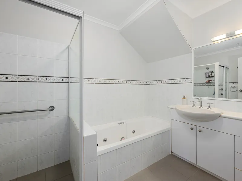 Designed for comfortable coastal living, the lower level offers two generous bedrooms, both complete with built-in robes and ceiling fans, along with the main bathroom featuring a separate bath and shower. The middle level boasts a spacious air-conditioned living area, powder room and internal laundry, while the upper level includes a light-filled dining space, functional kitchen and a convenient study nook.
