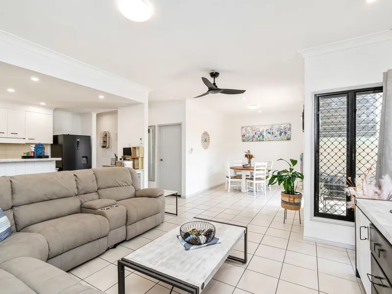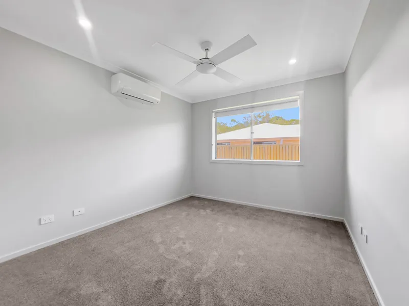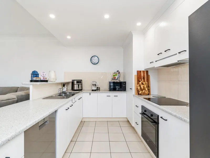 The home features a practical two-level layout with all three bedrooms and two bathrooms upstairs, while downstairs offers an open-plan kitchen, dining, and living area, plus an additional bathroom and laundry. This separation is ideal for noise control—perfect for early risers and shift workers.