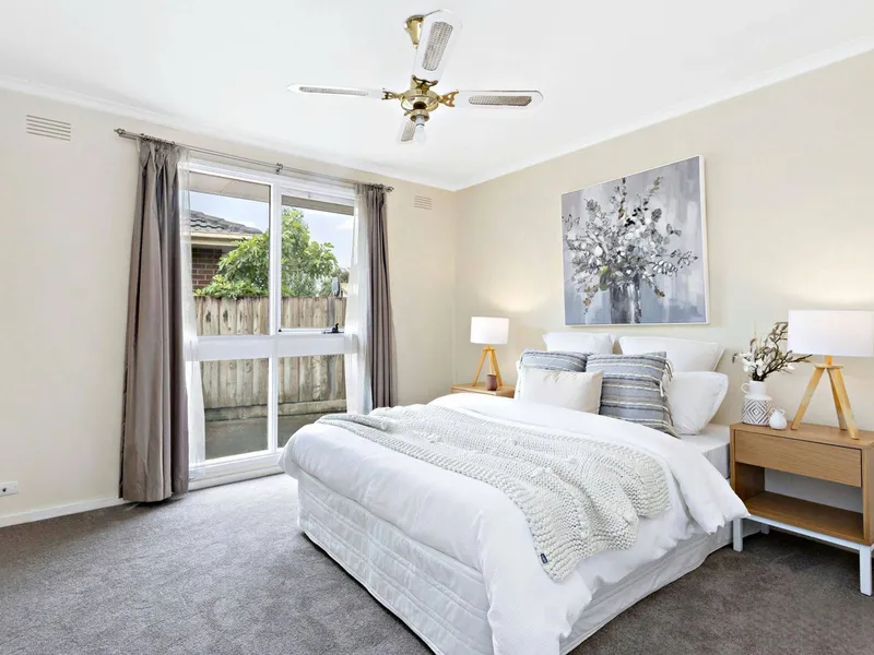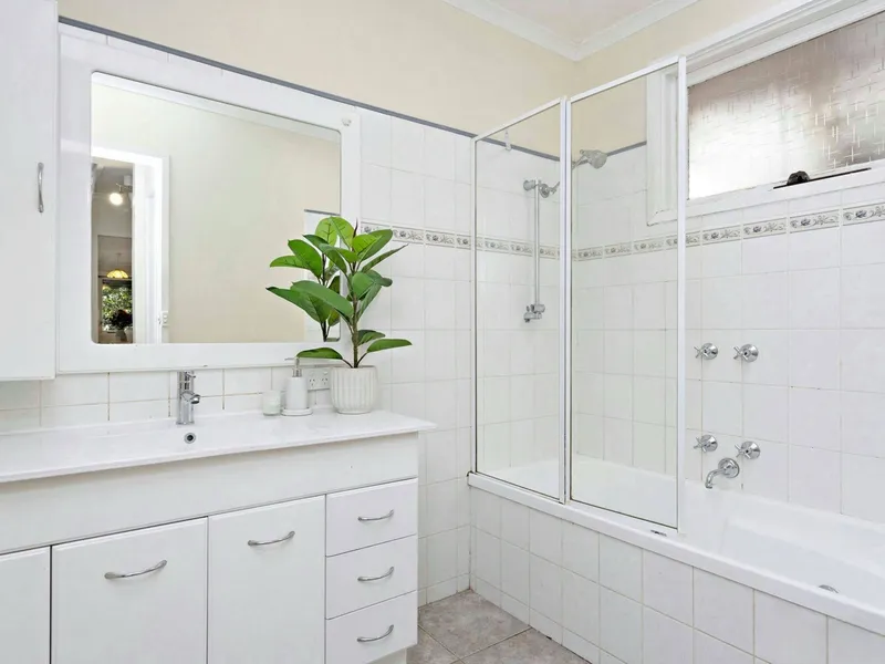 The three bedrooms are located away from the living areas, each equipped with ceiling fans, and two feature built-in robes. The tidy bathroom includes a separate w/c for added convenience.