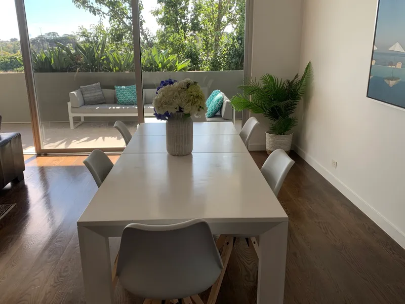 The main living area down the hallway from the bedrooms has a beautiful well-appointed kitchen with European appliances, large glass sliding doors off the main living area open onto an undercover balcony with outdoor furniture and a bbq.