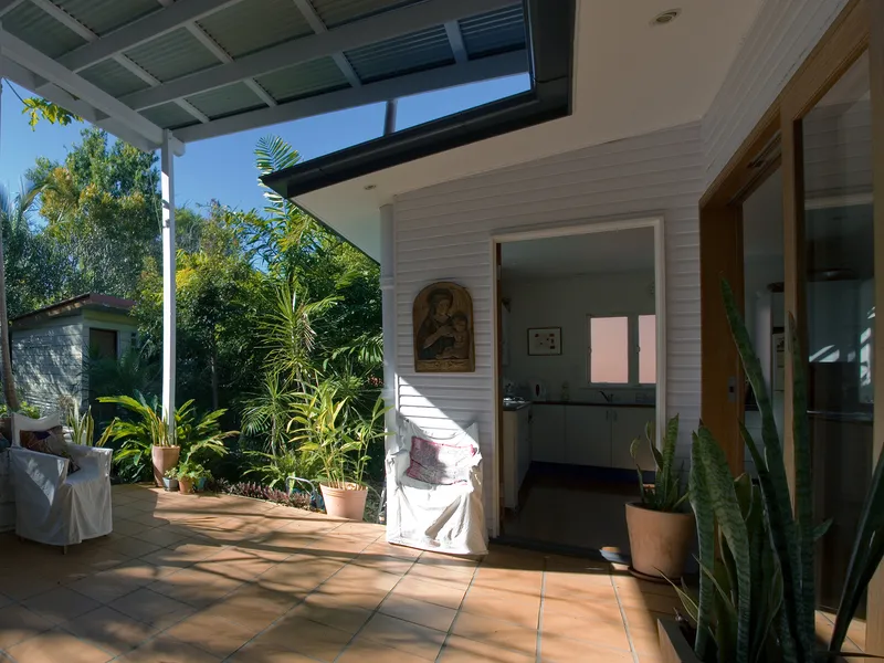 From the dining space, step out onto a covered patio overlooking a well maintained garden, creating a serene setting for outdoor living. Bifold doors in the living room open out to a charming front veranda, providing an additional space to unwind and enjoy the surroundings.
