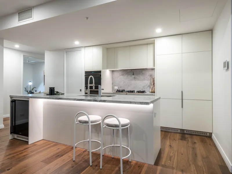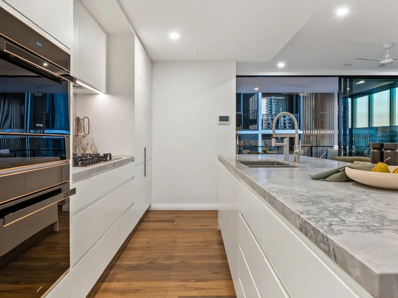 Apartment 1153 offers expansive open-plan living flowing onto a wide balcony with inner-city views. The designer kitchen features a large stone island bench, premium European appliances and a walk-in pantry with wine storage. Flexible in layout, the apartment includes three bedrooms plus a media room (or optional fourth bedroom), a luxurious master suite with ensuite and walk-in robe, main bathroom and guest powder room.