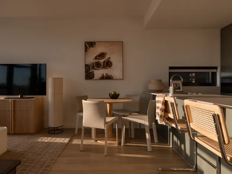 The residence encompasses an open-plan living/dining area seamlessly connected to a chic kitchen featuring stone surfaces Miele appliances, and a covered balcony.