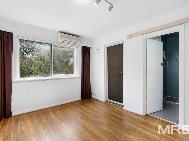 The spacious bedroom is bathed in direct morning sun, the perfect natural way to start your day, and features a built in robe and private balcony. The balcony is drenched in morning light, making it ideal for growing herbs or enjoying a quiet coffee while taking in leafy treetop views and the peaceful outlook across parkland.