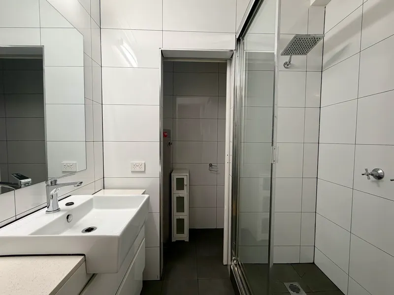 A separate modern bathroom of the living area, with large shower, toilet nook and personal hot water system. Additional highlights include a covered car space, intercom, NBN ready, and timber flooring throughout.