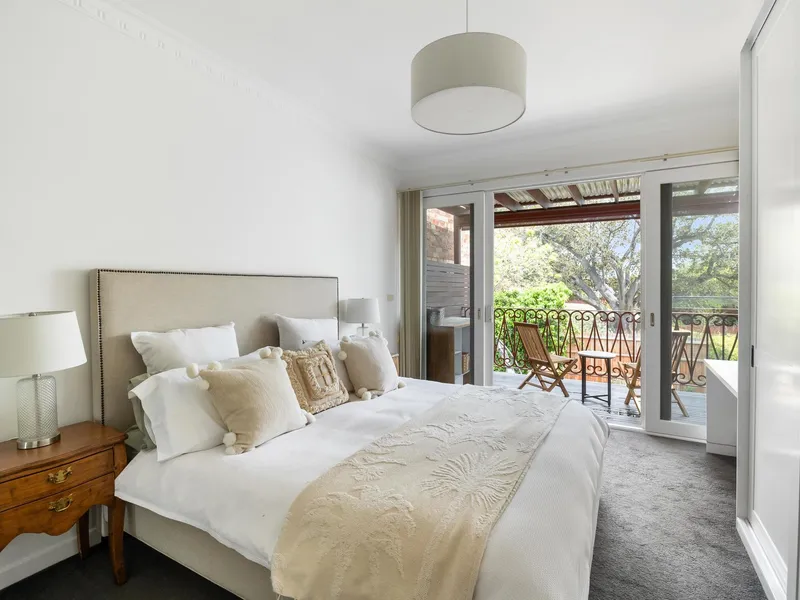 Renovated inside and out, this stunning three-bedroom, two-bathroom Art Deco residence enjoys its own gated access to Argo Reserve, making 'Rothesay' a true parkside jewel. Framed by silver travertine paving, the home opens to a wide entrance hall and a charming downstairs bedroom featuring decorative ceilings, a brick fireplace and double doors to a sun-drenched front patio.