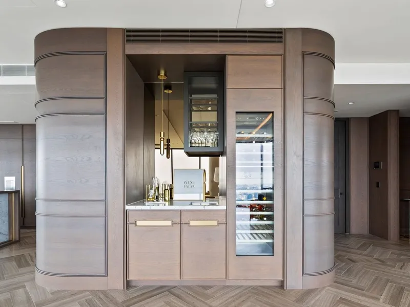 The heart of the home is a chef’s kitchen of exceptional caliber, featuring bespoke natural stone, a full suite of Gaggenau appliances, and concealed joinery, seamlessly combining performance and style. Expansive open plan living and dining areas provide the perfect setting for entertaining or relaxing, enhanced by European stone flooring, brushed gold accents, and integrated architectural lighting.