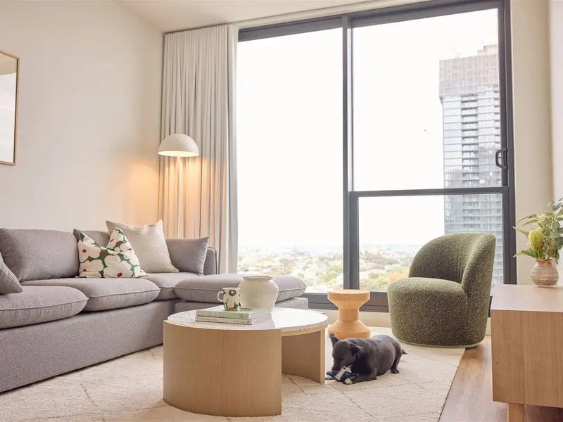The open-plan living space flows seamlessly onto a private balcony, filling the apartment with natural light and offering spectacular city views from the 37th floor. The kitchen is spacious and well-appointed, featuring sleek stone benchtops, stainless steel Bosch appliances including a dishwasher, gas cooktop, and integrated oven.