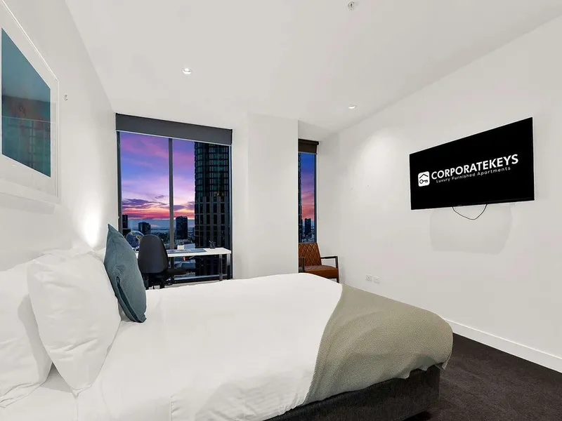Enjoy elevated city living in this stylish fully furnished 2-bedroom serviced apartment on Level 25 of the iconic Freshwater Place in the heart of Southbank, Melbourne. Boasting breathtaking panoramic views of the Yarra River, Melbourne CBD skyline and beyond, this urban retreat combines premium comfort with exceptional convenience. Situated just minutes from the Crown Entertainment Complex, Arts Centre, Flinders Street Station and a vibrant array of restaurants, cafes and cultural attractions, its the perfect base for both corporate stays and extended getaways.