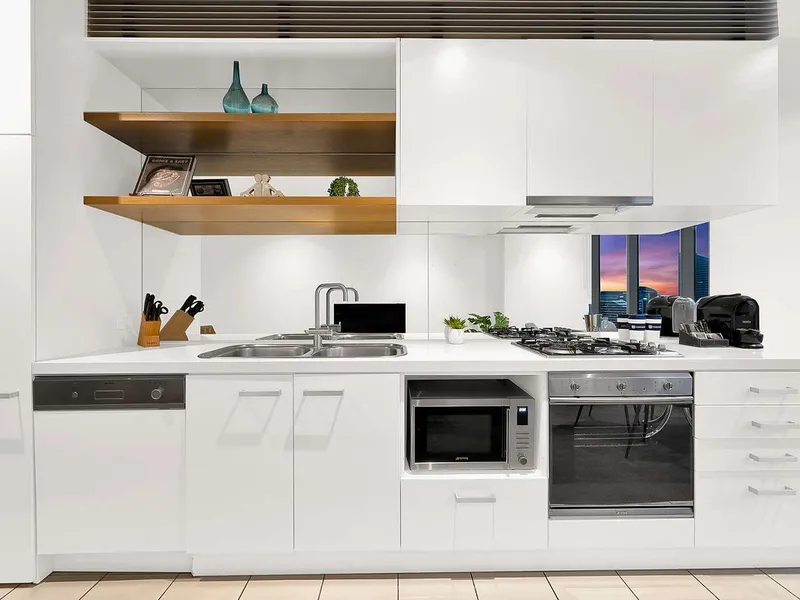 Inside, youll discover an open-plan living and dining area enhanced by floor-to-ceiling windows that fill the space with natural light. The modern, fully equipped kitchen features quality stainless steel European appliances, ample bench space and all the cookware you need to prepare meals at home. A generous bedroom with built-in wardrobes and a sleek bathroom with internal European laundry complete the apartments thoughtful layout.
