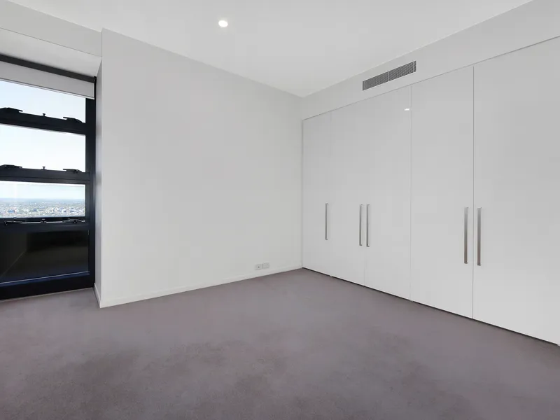 Positioned high above the city on the 56th floor of the renowned Eureka Tower, this impressive apartment captures sweeping, panoramic views across Melbourne’s skyline and the sparkling waters of Port Phillip Bay.