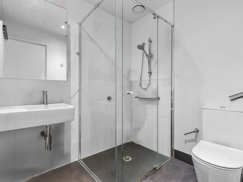 The apartment features a light-filled open-plan living and dining area flowing out to a private balcony with city views. The modern kitchen is equipped with quality appliances and ample storage, perfect for everyday living.