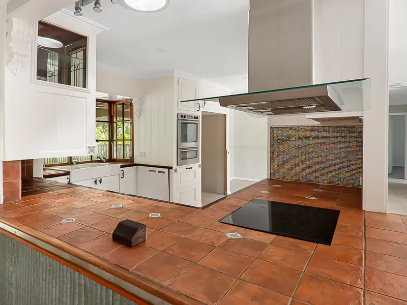 • Character-Filled Kitchen - A spacious kitchen with classic timber benchtops, ample storage, a double oven, and a modern cooktop, perfect for home chefs.