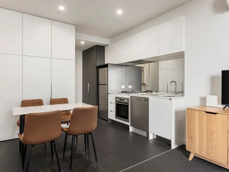 Positioned within the exclusive Ascent development, the residence features a sun-drenched open-plan living and dining zone, framed by expansive floor-to-ceiling windows. Seamless sliding doors extend the space onto a spacious covered balcony-perfect for unwinding or hosting against a stunning metropolitan backdrop.