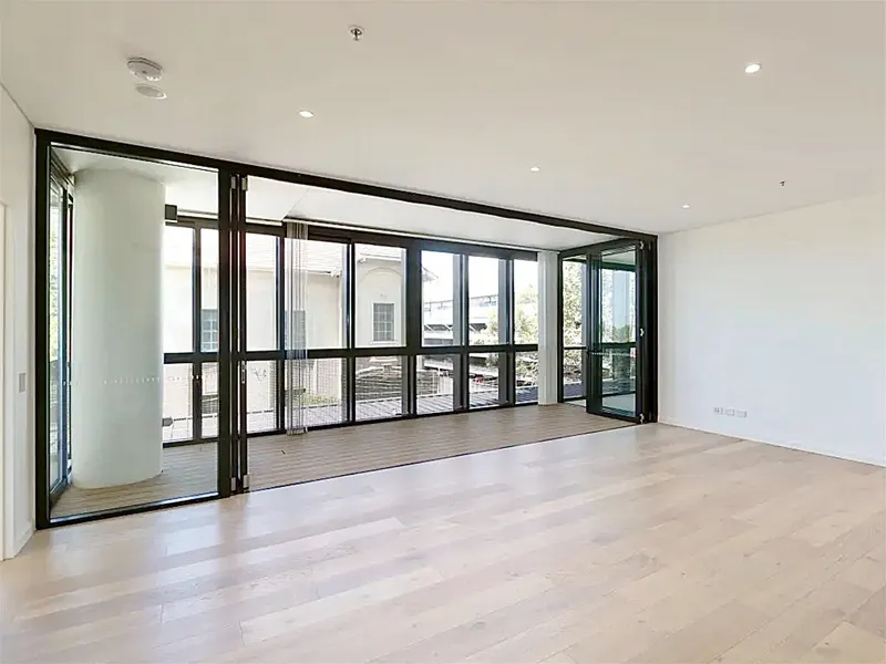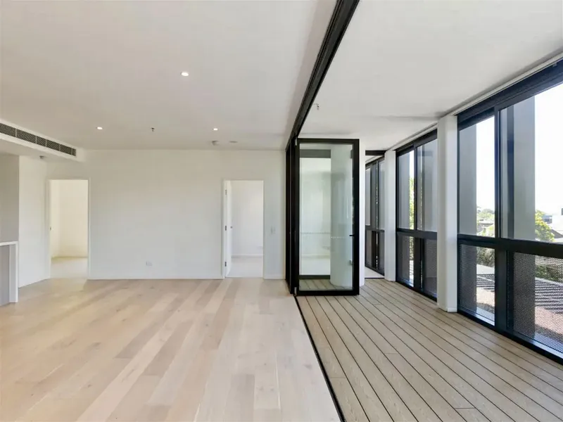 -Open living room with timber floor to ceiling glass onto large balcony