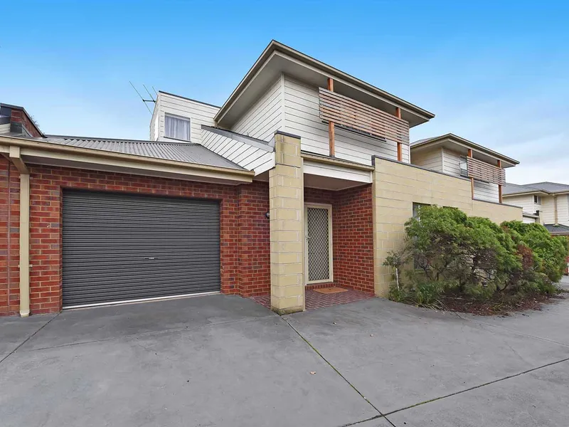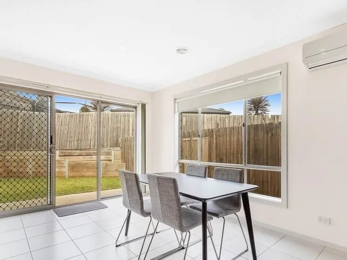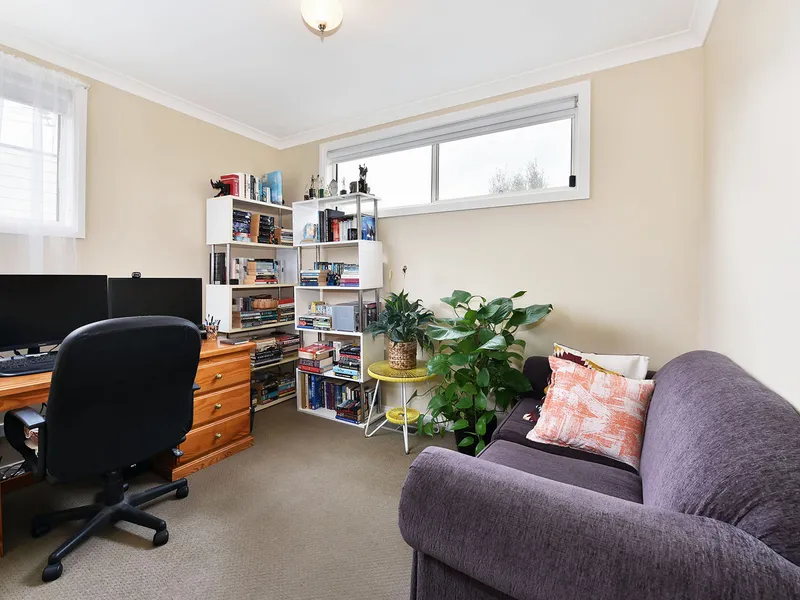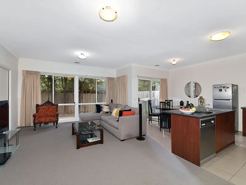 Open living/dining with built-in cabinetry, extends out to a paved, private courtyard and garden area, while a generously sized laundry opens onto a small sideway.