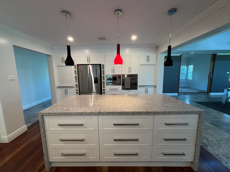 • Island bench with 40mm Caesarstone benchtops, waterfall edge, and casual dining option