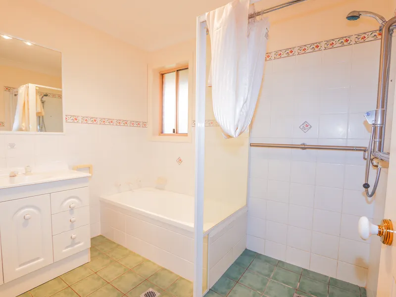 - Spacious tiled bathroom with vanity, bath and shower recess fitted with handrails.