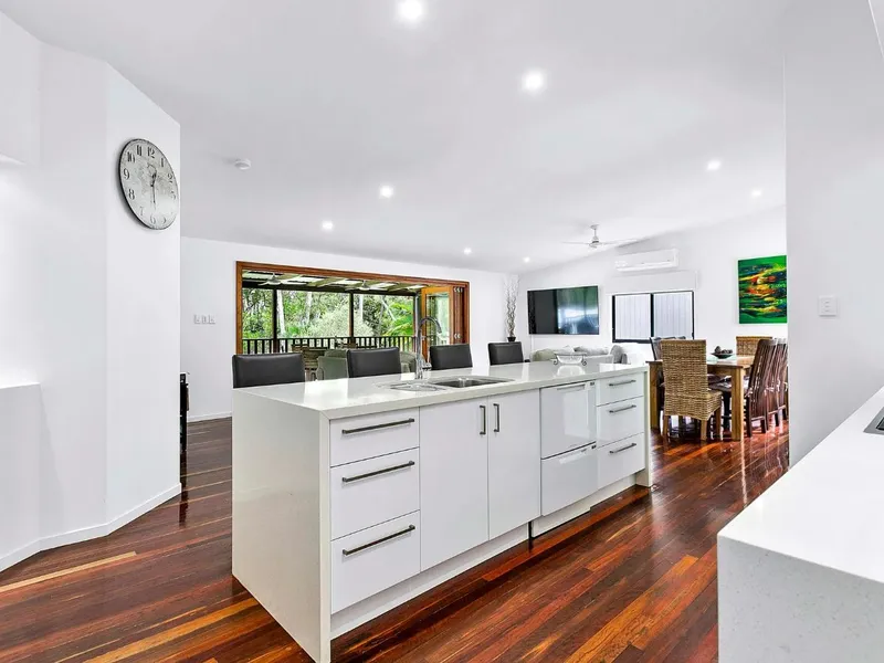 Perfectly positioned with direct private access to the pristine white sands of Toogoom Beach, this modern two-storey home seamlessly blends comfort, style and functionality for relaxed coastal living.