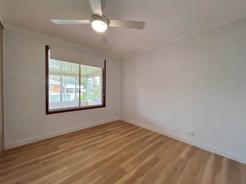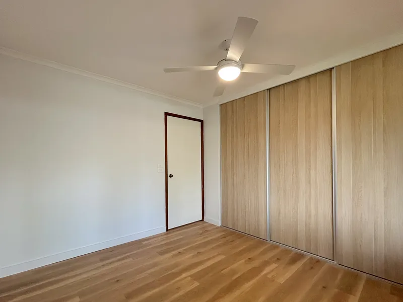 The home features three bedrooms, two of which include built-in wardrobes and ceiling fans for added comfort. The modern bathroom is well presented, and the laundry is conveniently located in a separate room.