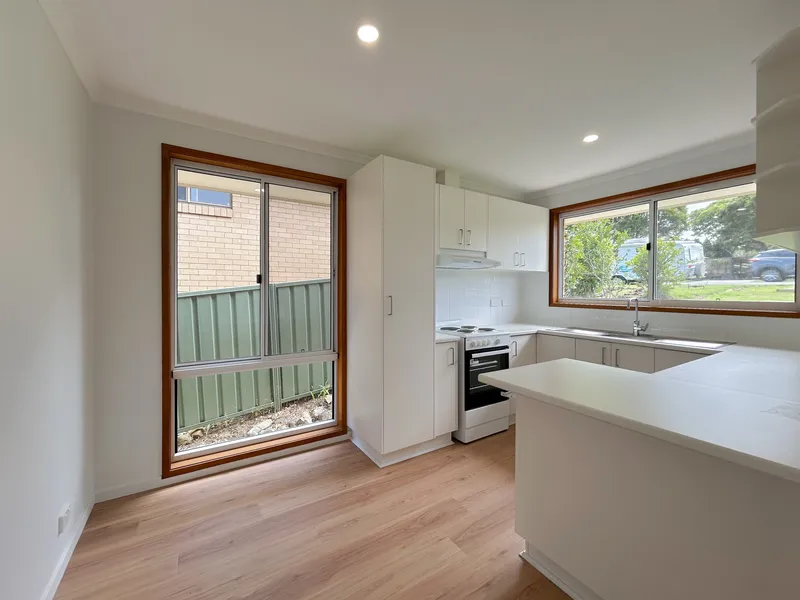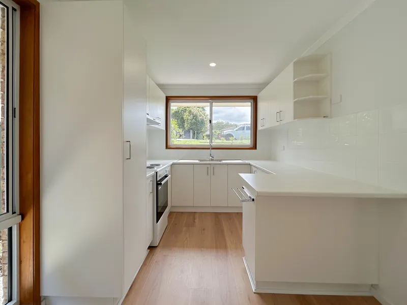 The near-new kitchen sits adjacent to the combined living and dining area, which is fitted with both air conditioning and ceiling fans to ensure year-round comfort.