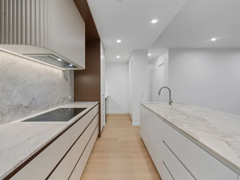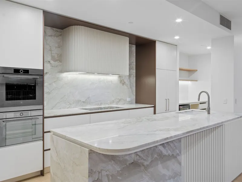 Internally, the apartment has been finished to the highest standard. The kitchen is a genuine centrepiece, featuring integrated V-ZUG appliances, Vintec wine storage, a built-in bar, and a substantial butler’s pantry. Exceptional cabinetry and joinery flow throughout the home, while the master suite is truly impressive, offering a full hidden wall of built-ins and uninterrupted river views; an outstanding space to wake up to each day. The second bedroom rivals a master suite in scale, and the third remains well-proportioned and highly functional.