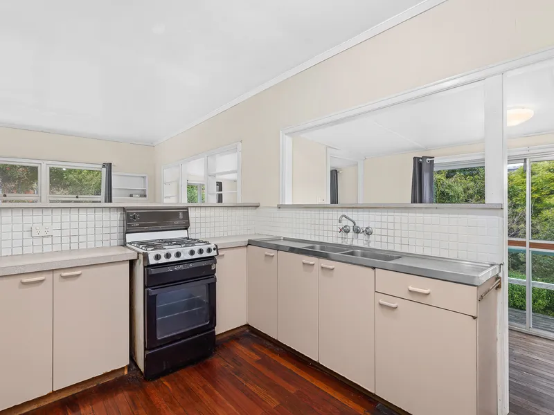 With timber floors and fans throughout, a spacious kitchen with gas cooking and cupboards abundant and a fridge-freezer included.