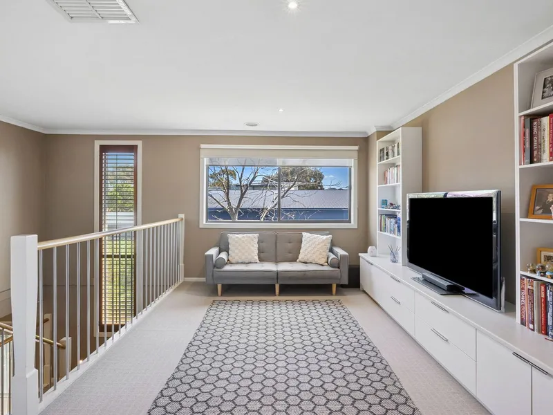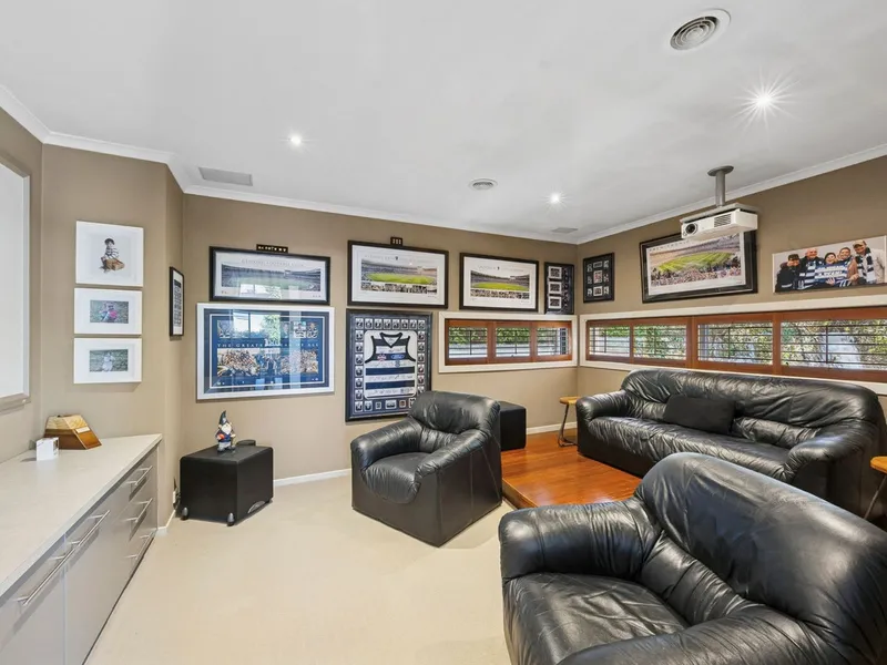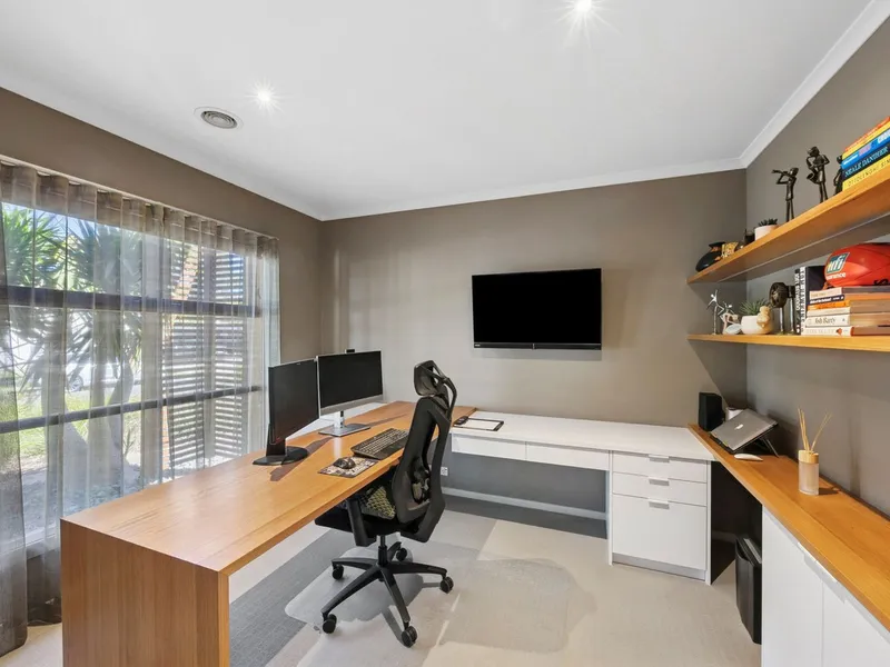 Inside, multiple living areas ensure every member of the family has room to unwind, including a dedicated home theatre, open-plan family hub and an upstairs retreat. A well-appointed home office with built-in cabinetry provides a quiet, practical workspace.