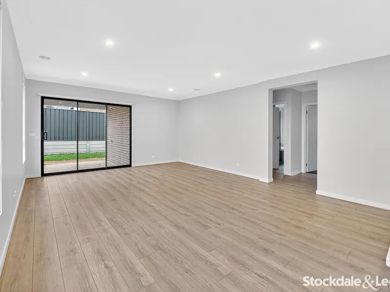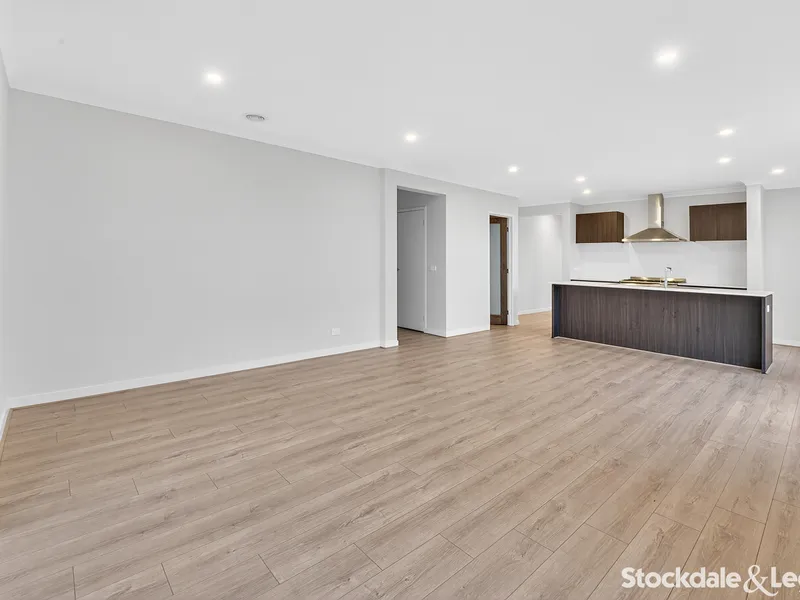 At the heart of the home, the modern kitchen is designed to impress with stone benchtops, stainless steel appliances, a 900mm oven, and a spacious walk-in pantry. Overlooking the main living and dining area with floorboards underfoot, it provides the perfect setting for everyday living and entertaining.