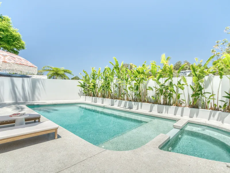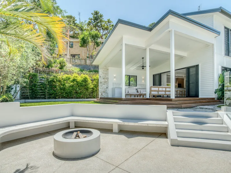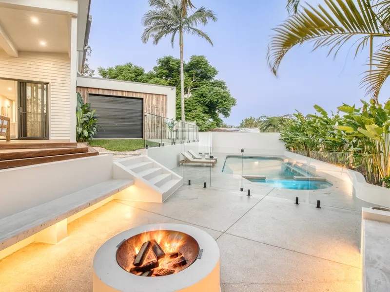 The outdoor area provides a private retreat, with a sparkling in-ground pool and heated spa surrounded by established, low-maintenance gardens. A sunken fire pit area and outdoor shower further enhance the home's relaxed coastal appeal. Rear garage access to the backyard adds additional convenience.
