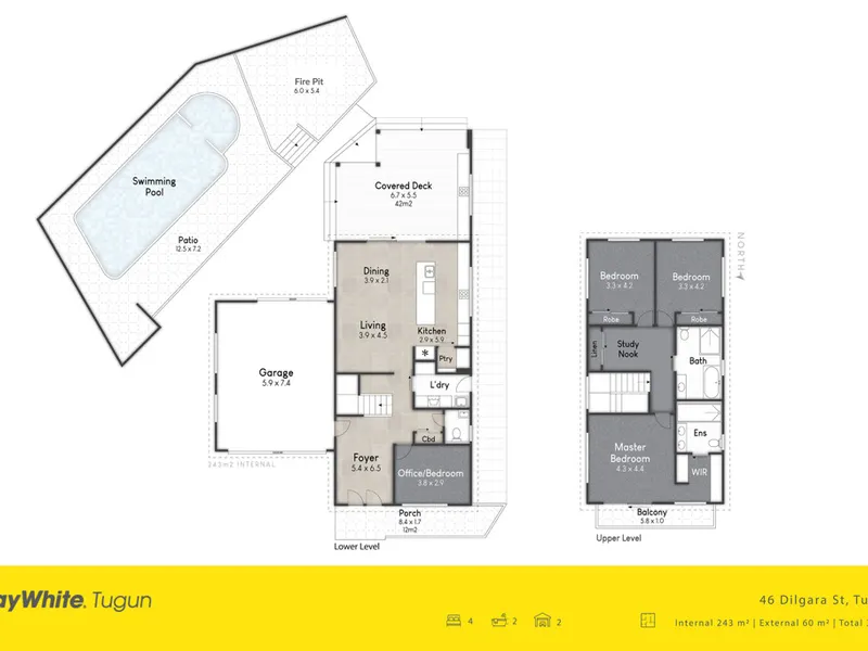 Upstairs, a central study nook connects four well-proportioned bedrooms and a beautifully appointed main bathroom featuring a freestanding stone bath. The master suite offers a peaceful escape, complete with raked ceilings, a private balcony, walk-in robe and luxurious ensuite. A downstairs powder room services the lower level.