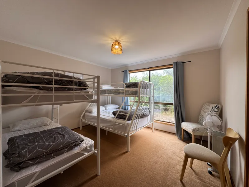The 3 bedrooms are furnished with two queen beds and a two sets of bunks.